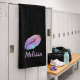 This design features a black background with a pink and blue lipstick kiss with your name printed at the bottom right hand corner of each item in the bath set.