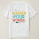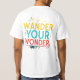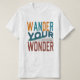 The t-shirt features the phrase "Wander Your Wonder" in a vibrant multicolor display. Each word is a different colour, creating a sense of joyful exploration. The design itself is simple and uncluttered, letting the multicolored text take centre stage. This is a perfect t-shirt for anyone who embraces adventure and the pursuit of their own unique curiosity.