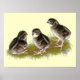 Coturnix quail chicks are patterned in browns and earth tones on their baby fuzz for their first weeks of life. If they lie still, they can hardly be noticed!