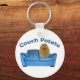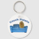 Button Keychain of a funny potato character on a blue couch with Couch Potato wording. The perfect gift for that person who likes to spend a lot of time relaxing.