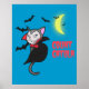 This is a drawing of a vampire cat. The cat is giving you a scary look. It has fangs, cape, and a bow tie. There are bats flying around the kitty, toward the glowing crescent moon. It says "Count Catula" in a bloody font.