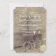 Rustic country wedding invitation features horseshoes couple, old burlap, flowers and champagne.