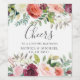 Chic floral design features "cheers to a lifetime happiness" with your names and wedding date in white, flanked by clusters of autumn flowers and green foliage set white background.