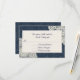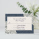 Chic wedding RSVP response card done in a blue on blue denim floral damask pattern. Graphics of elegant ivory crocheted looking doilies decorate the top right and bottom left corners. The back of the card is done in the same blue denim damask pattern. Matching wedding products available.