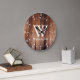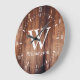 Dark brown barn wood planks print clock with white roman numerals and tick marks for hours and minutes plus your personalised monogram letter and full family name in white.