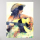 A pretty young teenaged girl in a yellow flower sundress and wide brimmed straw hat, strums on an acoustic guitar. Original photograph digitally transformed to resemble a watercolor painting.