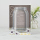 Stunningly beautiful Southern country-inspired wedding invitations featuring an illustration of a mason jar with twine tied around the neck of it, white and purple daisies laying at the foot of the jar, over a vintage brown background, and a yellow gingham table top. Your wedding details are contained within the glass jar, to where if your text extends into the shading of the jar, the text will be shaded too. The backside of these invitations offer the option to have the reception time and location printed as well.