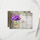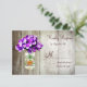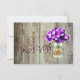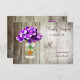 These mason jar and purple hydrangea flowers wedding rsvp cards are perfect for country style wedding using purple flowers in their wedding colours. The mason jar is against a rustic barn wood background. It also has a rustic wooden heart on the front of the mason jar.