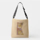 This crossbody bag features a patchwork quilt style letter K monogram. The letter K consists of muted colours of yellow and mauve to give this image a casual feel. The solid background colour may be customised if you desire. Quickly and easily personalise to create a one of a kind product.
