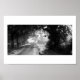 On a frosty, autumn morning, bright sunshine illuminates a country road in Cheshire, England. A black and white photograph with a white border for easy framing or hanging.