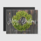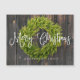 Design is composed of a luscious green foliage wreath on a dark wooden background with a holiday greeting written in playful cursive script typography.