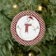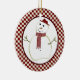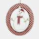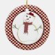 Country snowman Christmas tree ornament, done with a red and cream country check round frame. A smiling snowman complete with red hat and scarf is set in the white circular middle of the ornament. Great ornament, also makes a nice holiday decoration, and great for ornament gift exchanges.