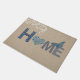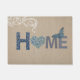 Patchwork letters with blue and white floral heart spell out Home in this pretty country style design on a rustic burlap effect linen background. Added details of a blue butterfly and white floral scroll pattern. Designed by Lark Designs