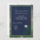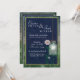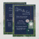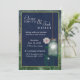 Country style mason jar with glowing white light hanging against a dark blue background. Soft white and pink flower accents the design. This presents an old fashioned look yet is stylish for today's bride. Easily edit for your own wedding invitation.