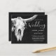 Invite your guests to your special day with these black and white country western farmhouse rodeo bull skull wedding invitations. Rustic texture background to customise your information on. Image copyright Marg Seregelyi Photography.