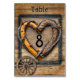 Rustic country wedding barnwood table card with heart shape, wood twig frame for your table number cards and wagon wheel with silver horse shoe.