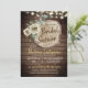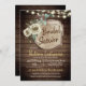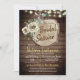 Rustic Country Wood Slab, cross section tree slice with boho watercolor floral rose, pine cones and eucalyptus over barn wood back drop with string lights that sparkle over top. Gold hand script fonts and fun typography style information can be personalised as preferred.
