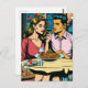 A couple on a date at an Italian restaurant sharing a plate of spaghetti. Cute comic book style cartoon pop art ai.