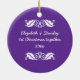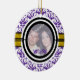 Couple’s first Christmas purple damask pattern custom photo ornament. There is a black and white circle for your photo and a black and yellow stripe.