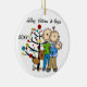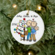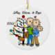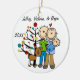 A pretty round ceramic keepsake Christmas holiday ornament features a stick figure couple with a baby boy in a blue blanket and a dog standing in front of the decorated Christmas tree with areas you can easily customise with names and date to the current year! This beautiful holiday keepsake ornament makes a great gift for anyone who had a new baby boy in the current year!