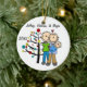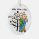 A pretty round ceramic keepsake Christmas holiday ornament features a stick figure couple with a baby boy in a blue blanket standing in front of the decorated Christmas tree with areas you can easily customise with names and date to the current year! This beautiful holiday keepsake ornament makes a great gift for anyone who had a new baby boy in the current year!