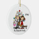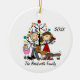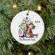 A pretty round ceramic keepsake Christmas holiday ornament features a stick figure couple, baby daughter in pink carriage, and three dogs in front of a decorated Christmas tree with areas you can customise with your family name and the current year! This cute holiday keepsake ornament makes a great gift for the young family to commemorate a special year!