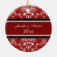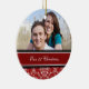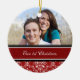 Couples 1st christmas photo ornament customisable with your own photo, names and date in elegant red, black and white classic floral damask pattern. A stylish way to decorate your christmas tree or home for the holidays. The perfect way to remember your first christmas together as a couple.
