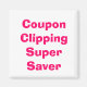 Coupon Clipping Super Saver magnet lets everyone know you know how to save money. Makes a fun fridge magnet, a gift for your favourite couponing friend or use them as coupon swap meet party favours. Pink lettering on white.