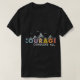 The t-shirt features a bold, multicolored design with the text "Courage Conquers All" prominently displayed. Each word is a different vibrant colour, creating a visually striking and motivational statement. (I can't generate the image itself, but this description should help you imagine it.