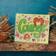 The inspirational word "Courage" is a bright green against a pale yellow. The word is surrounded by floating peach, pink, and red hearts. The "Courage" artwork was rendered in multimedia of pastel and watercolor on paper. Inspirational artwork by Laurel Latto for DonnaBellas Angels.