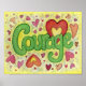 The inspirational word "Courage" is a bright green against a pale yellow. The word is surrounded by floating peach, pink, and red hearts. The "Courage" artwork was rendered in multimedia of pastel and watercolor on paper. Inspirational artwork by Laurel Latto for DonnaBellas Angels.