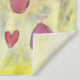 The inspirational word "Courage" is a bright green against a pale yellow. The word is surrounded by floating peach, pink, and red hearts. The "Courage" artwork was rendered in multimedia of pastel and watercolor on paper. Inspirational artwork by Laurel Latto for DonnaBellas Angels.