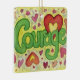 The inspirational word "Courage" is a bright green against a pale yellow. The word is surrounded by floating peach, pink, and red hearts. The "Courage" artwork was rendered in multimedia of pastel and watercolor on paper. Inspirational artwork by Laurel Latto for DonnaBellas Angels.