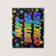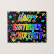 This exciting and lively birthday-themed jigsaw puzzle design has the message "HAPPY BIRTHDAY, COURTNEY" with the characters having a colourful rainbow spectrum inspired gradient pattern, along with a fun star field background pattern. An exciting puzzle like this might be a fun way to send birthday greetings to somebody named Courtney. [~Z0000468]