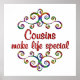 A pretty way to let that loved cousin know how you feel. Enjoy this colourful design with flourishes and the words - Cousins make life special.