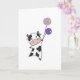 The cow flies up with purple balloons. Cows are cute animals for children. A calf is a baby cow.