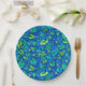 Paper plate featuring colourful floral pattern - yellow pond lily flowers, broad green leaves and blue dragonflies. Hand drawn texture