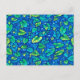 Postcard featuring colourful floral pattern - yellow pond lily flowers, broad green leaves and blue dragonflies. Hand drawn texture