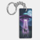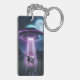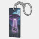 Mysterious scene of a UFO lifting a cow in a beam of light against the backdrop of a night sky with a full moon. Perfect illustration for fans of science fiction, and fantastic stories about contact with extraterrestrial civilizations.