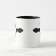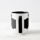 A black and white Ringer mug showing the head of a cow on both sides of mug.