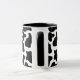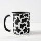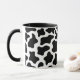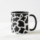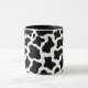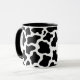 This two-tone coffee mug is shown in a cute black and white cow print.