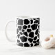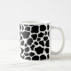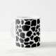Coffee mug is shown in a cute black and white cow print.