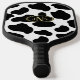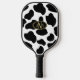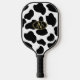 Black and white cow print with gold monogram, pickleball paddle with same design on both sides. Black monogram oval and gold monogram that can be changed to a name or any text as preferred.
