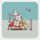 A funny illustration of a black and white cow riding a motor bike or retro moped.