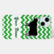 This stylish green and white phone case features the black silhouette of a moo cow! The background features a repeating green and white zig-zag chevron pattern with space to add your own name or short message in a green script font! Open the full editor to change the chevron colour!