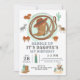 A "saddle up" cute and whimsical wild west cowboy first birthday invitation in terracotta browns and blues for a boy, with western gear cowboy gear and ranch animals. Saddle, steer, horses, cactus, saddle and lasso. Everything as cowboy needs. It's his first rodeo! The back of the invite has a dark brown barn wood effect.