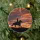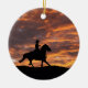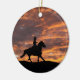 A pretty country western themed ornament with a cowboy riding his horse in a pretty sunset.