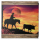 Brighten Your Home with this Unique "One of a Kind" Cowboy and Longhorn Steer Ceramic Tile! It Features a Cowboy Riding a Horse Herding a Longhorn Steer During a Beautiful Orange Sunset...with Wood Borders!