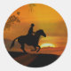 A great country western themed sticker of a cowboy riding his horse in a sunset. A western fine art photography piece. A great way to add a country western or cowboy theme to your projects or correspondence.