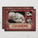 Sweet grunge-look wild west birth announcement card in red, cream, and brown with rocking horse, horseshoe, cowboy boots, and 3D-look rope trims.